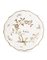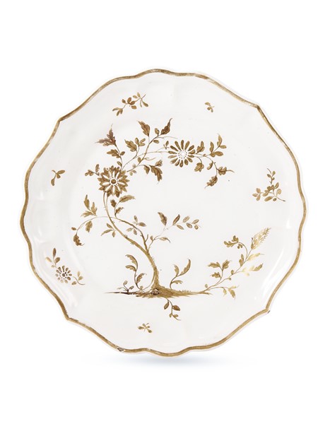 Manifattura di Felice Clerici o Pasquale Rubati, Milano, 1760-1780. Piatto mistilineo in maiolica con decorazione in monocromia oro su smalto bianco con un motivo di ispirazione orientale e rami con fiori a corolla aperta. Sul retro è presente la pennellata, 'chiodo', in bruno (d. cm 20) (sbeccature, difetti, usure all'oro, un foro passante al centro di un fiore)
