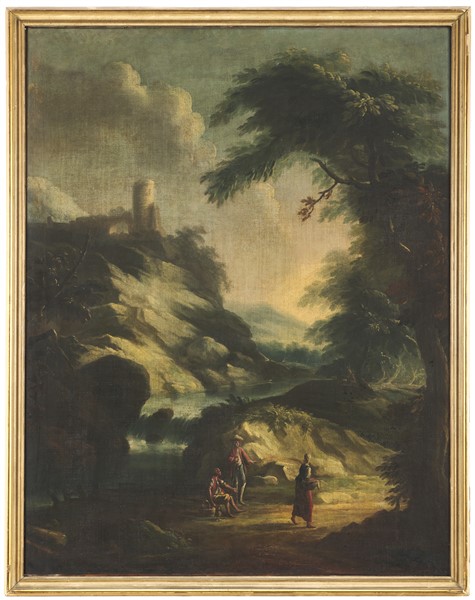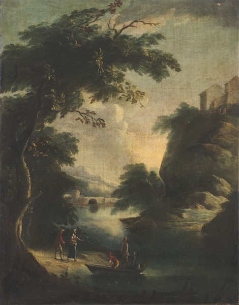 Coppia di dipinti ad olio su tela raffiguranti "Paesaggi fluviali con figure"