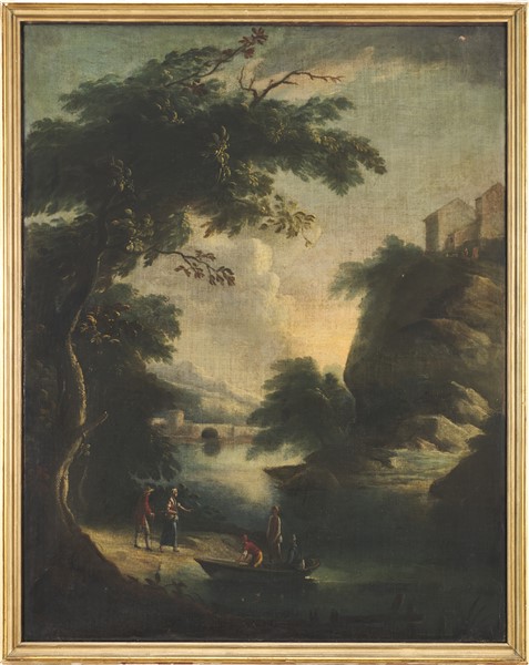 Ignoto Coppia di dipinti ad olio su tela raffiguranti "Paesaggi fluviali con f