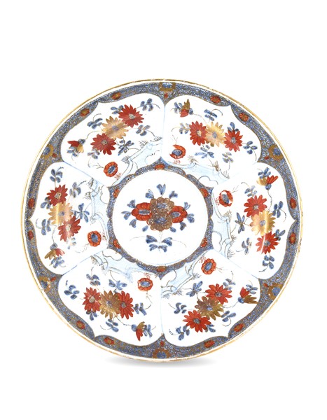 Manifattura di Pasquale Rubati, Milano 1770-1780. Piatto tondo in maiolica con bordo profilato in oro con riserve radiali Imari in blu, rosso e oro con rocce in azzurro, fiori e spirali. Sul retro la marca in bruno F.P.R (d. cm 23,2) (lievi difetti)
