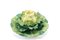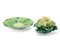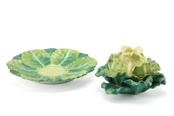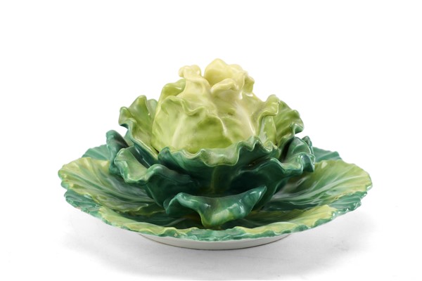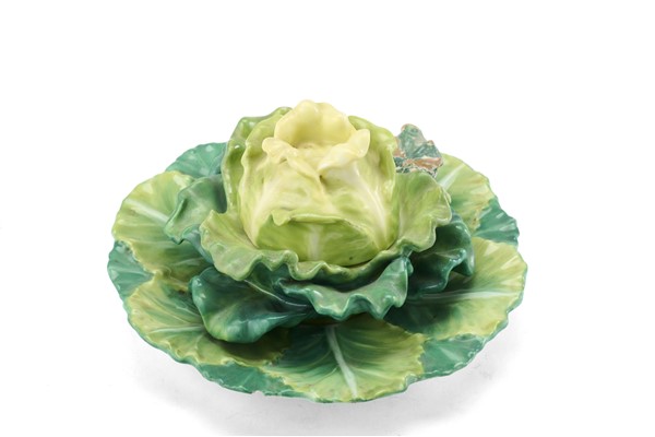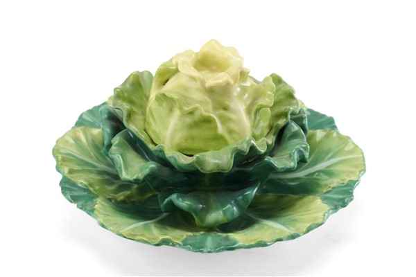 Manifattura di Jacob Petit, Francia, 1840 circa. Zuppiera con vassoio in forma di cavolo in porcellana con fogliame a rilievo. Marcata JP in blu (d. cm 18) (difetti e restauri)