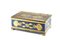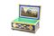 Cofanetto in legno e cartone dipinto e dorato con decori in pastiglia a palmette e cornici a rilievo, interno con stampa policroma raffigurante paesaggio montano con armenti. Secolo XIX. Etichetta cartacea "Gallois" sul fondo (cm 40x15,5x25) (difetti)