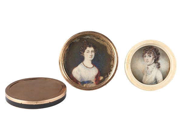 Arte del secolo XIX. Lotto composto da una tabacchiera in avorio con coperchio decorato da miniatura raffigurante Gentildonna ed una in tartaruga e oro basso con all'interno ritratto di dama con scialle rosso (d. max cm 8) (difetti)