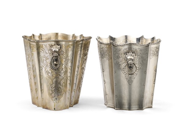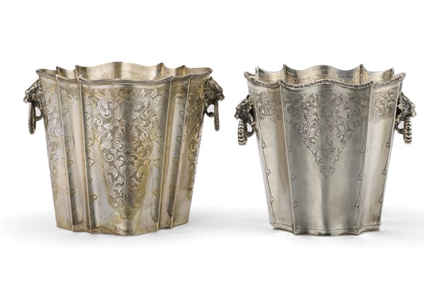Due rinfresca bottiglie sagomati in argento con corpi incisi a motivi vegetali. Anse ad anello sorretto da teste ferine. Milano, prima metà secolo XX (g 2600) (h. max cm 22) (lievi difetti)