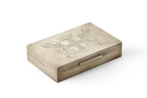 MARIO BUCCELLATI. A silver box cigarette grained with engraved cover bearing the coat of arms of Alexandria and motto "Deprimit elatos levat alexandria stratos". Inside engraved with small flowers. Signed in the inner band "M. Buccellati" (cm 9x6) (g 140) (minor defects)