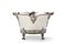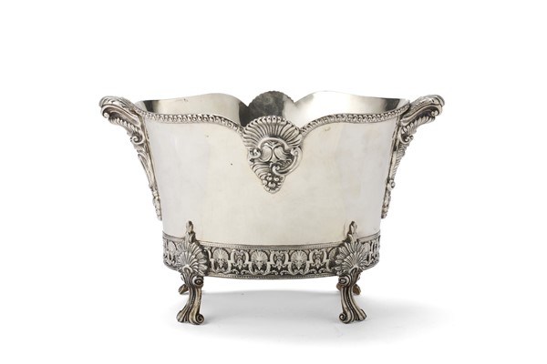 Cachepot di forma mossa biansato in argento con profilo cordonato, corpo costolato con decoro a volute fogliate e frutti, fascia inferiore con valva di conchiglia alternata a decoro stilizzato, piedi terminanti a ricciolo. Punzoni abrasi (g 2300) (cm 37x22x25) (difetti)
