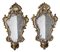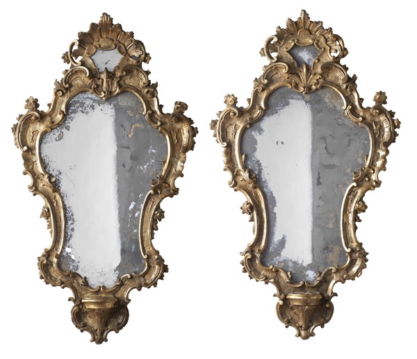 Coppia di grandi ventole di forma mossa in legno intagliato e dorato a mecca con cornici a volute contrapposte e cimasa specchiata. Secolo XVIII (cm 108x62) (difetti e mancanze)