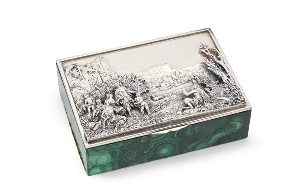 Scatola lastronata in malachite con ghiera e coperchio in argento in fusione a paesaggio con figure mitologiche. Milano, argentiere A.Vallin (g netti 520) (cm 16x5x11) (difetti)