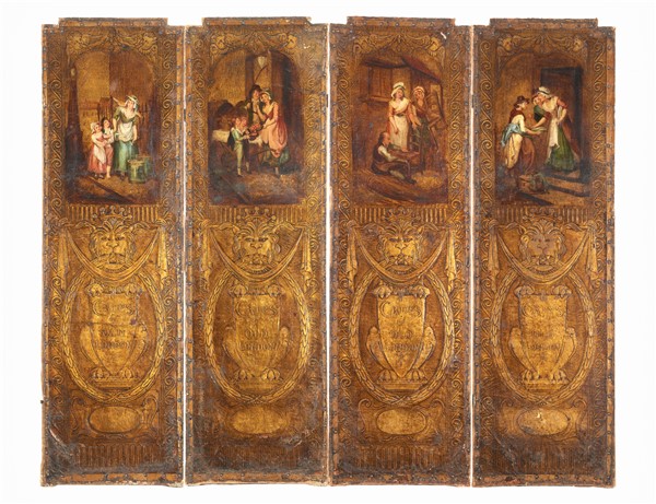 Paravento a quattro ante in cuoio impresso a putti alati e mascheroni ferini con iscrizioni ''Cries of Old London''. Cartelle dipinte con scene di venditori ambulanti da incisioni ideate da Wheatley Francis. Inghilterra, secolo XIX (cm 250x183) (difetti e piccole mancanze)