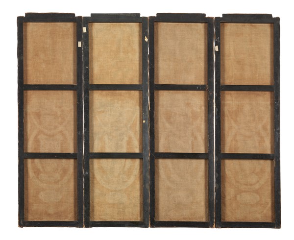 Lotto 820 | Paravento a quattro ante in cuoio impresso a putti alati e mascheroni ferini co