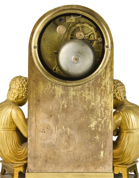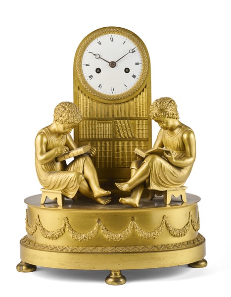 Pendola d'appoggio a soggetto "à la lecture" in bronzo dorato. La cassa è formata da un basamento ellittico decorato a festoni su cui poggiano due figure allegoriche a tuttotondo di fanciulli intenti nella lettura. La parte superiore di forma parallelepipeda è guarnita da un bassorilievo in foggia di biblioteca. Quadrante in smalto bianco a cifre romane. Lancette modello "Breguet". Movimento settimanale con suoneria delle ore e delle mezze su campanello. Sospensione a filo. Francia, 1820 circa (h. cm 35) (lievi difetti)
