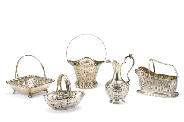 Lotto composto da tre diversi cesti, un versatoio e un porta bottiglia in argento decorato a finto canestro. Milano, argentieri Fratelli Cacchione (h. max cm 31) (g 3200) (lievi difetti)