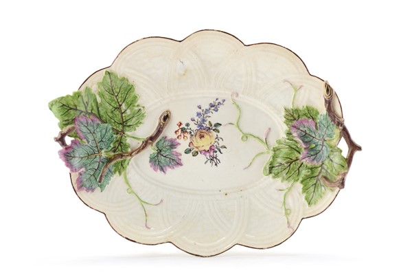 Manifattura di Chelsea, secolo XVIII. Vassoietto in porcellana policroma a forma di cestino di vimini con tralci di fiori nel cavetto e foglie di vite con rami nodosi. Marcato sotto la base (L. cm 28) (difetti, restauri ad un manico)