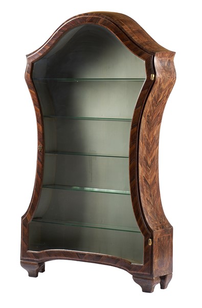 Vetrina lastronata in palissandro e bois de rose di forma sagomata ad un anta con vetro. Secolo XVIII (cm 102x170x23) interno a ripiani in vetro di epoca successiva (difetti)