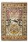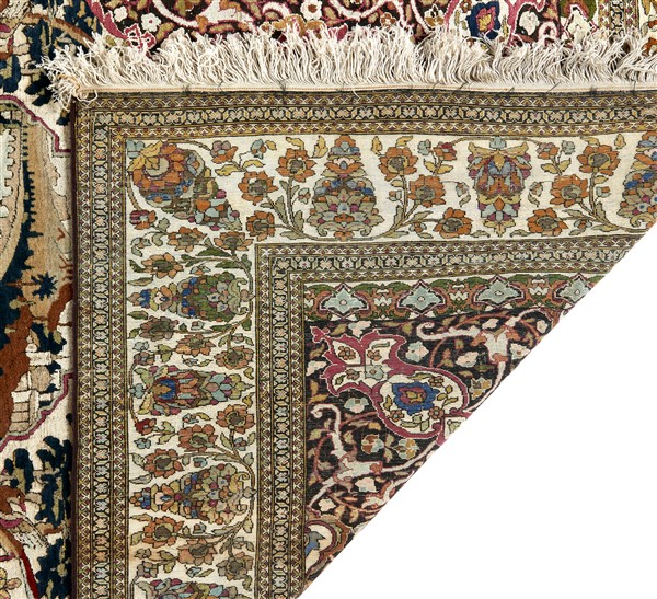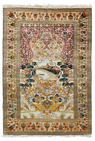 Tappeto preghiera Keshan, Persia, fine secolo XIX. Annodato in seta su ordito e trama azzurra in seta. Mirab a fondo bianco latte decorato con un medaglione con puntali e cartigli al cui interno sono raffigurati un paesaggio fluviale con rovine, architetture e scene bucoliche con animali e fiere. Ai due lati alla base del Mirab due alberi della vita sorgono da colline. Bordura a fondo bianco decorata con motivo Herati formato da bouquet di fiori legati da rami fioriti, tipica bordura Medacyl che racchiude all’interno e all’esterno la bordura principale (cm 192x132) (difetti)