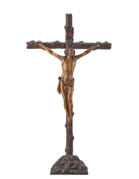 Scultore del secolo XVIII. "Cristo crocifisso" figura in legno intagliato su croce poggiante su base in forma di finta roccia di epoca successiva (h. tot cm 95) (piccole mancanze e restauri)
