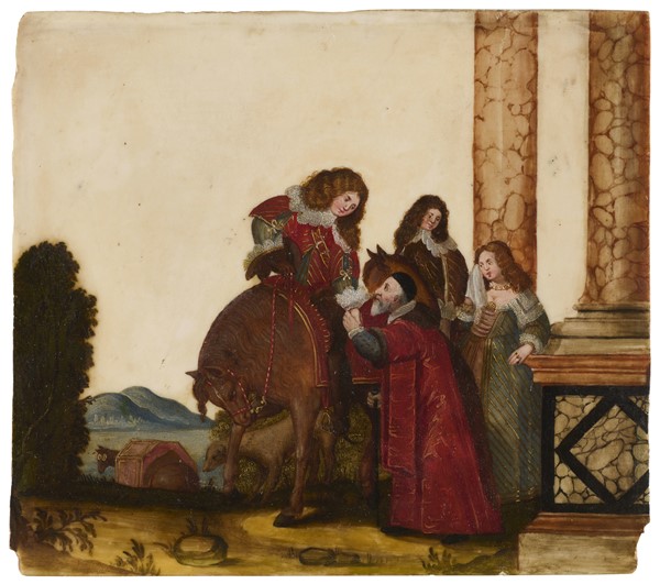 Scuola olandese del secolo XVII "La partenza" olio su pietra (cm 27,5x31,5) in