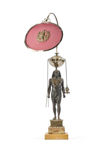Lucerna in argento con sostegno a figura egizia in bronzo brunito reggente vaschetta a doppio beccuccio e parafiamma ovale su arco. Roma, secolo XIX, argentiere Pietro Paolo Spagna (Roma 1817-1861); base gradinata in marmi vari, attrezzi pendenti e pannello ovale nel parafiamma di epoca successiva (h. cm 52) (difetti)