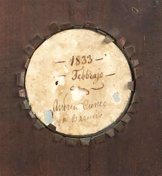 Giovanni Tosetti, 19th century. "Portrait of Andrea Cuneo" miniature on ivory (d cm 7) signed to the right. Back Entry 1833 February Andrea Cuneo was Barnico (?) Framed (defects)