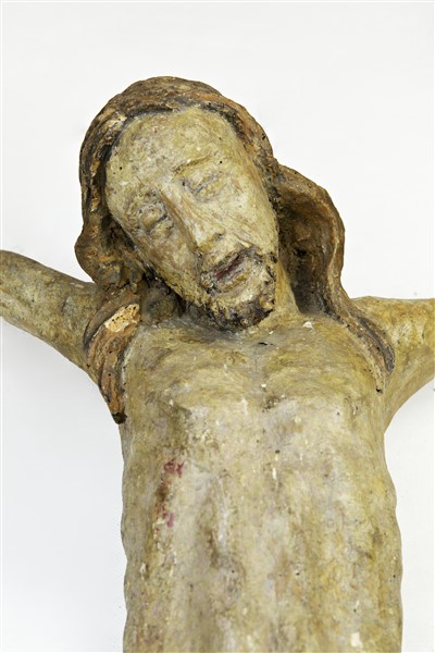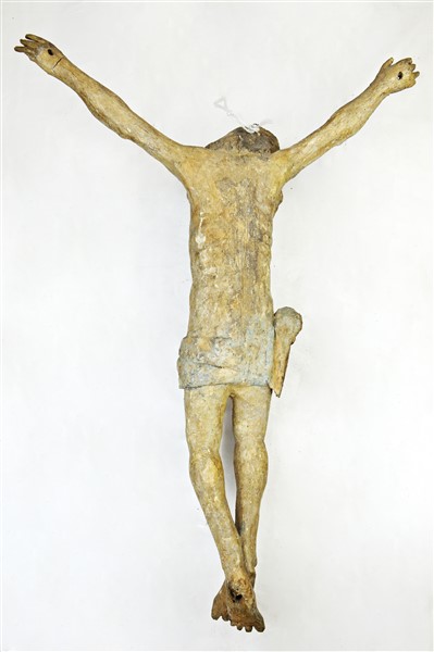 Sculptor of the end of the 16th century. "Christ crucified" in wood carved and lacquered (cm 69x101) (losses and restorations)