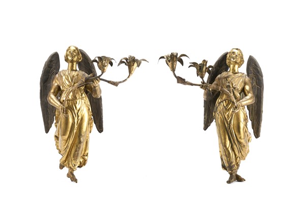 Coppia di angeli in rame e lamierino dorato reggenti rametto fiorito con doppio porta candela. Secolo XVIII-XIX (h cm 47) (difetti e restauri)