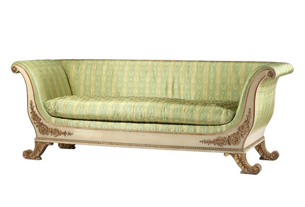 Divano a barca in legno intagliato, dipinto e dorato, bordure a palmette e rosette, piedi a ricciolo con voluta fogliata. Seduta, schienale e braccioli imbottiti e rivestiti in tessuto. Secolo XIX (cm 238x86x71) (difetti e restauri)