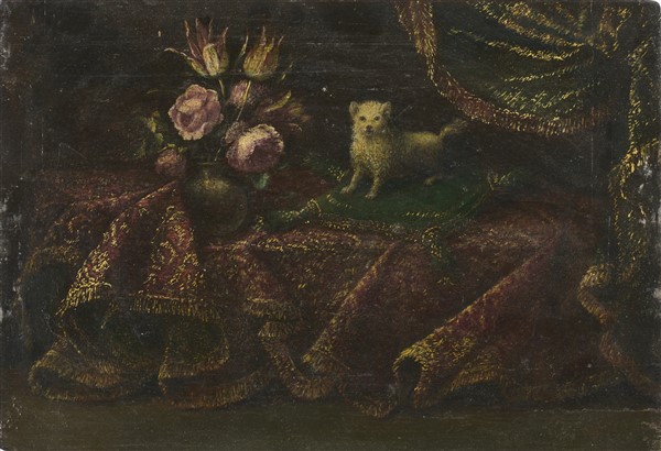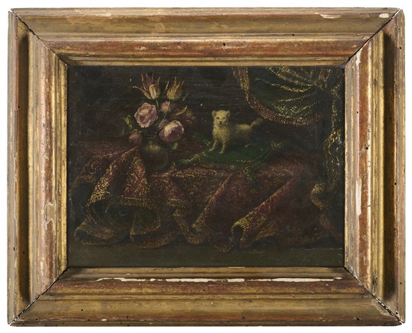 Lotto 866 | Scuola del secolo XVIII "Composizione con tappeto, fiori e cagnolino" olio su