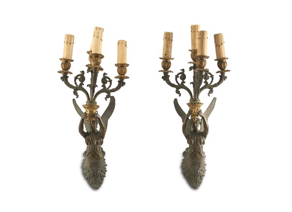 Coppia di applique a quattro luci in bronzo brunito e dorato con sostegno a busto di vittoria alata reggente bracci a volute. Secolo XIX (h. tot cm 52) Elettrificate in epoca successiva (lievi difetti)