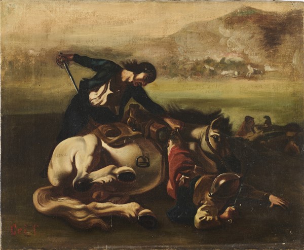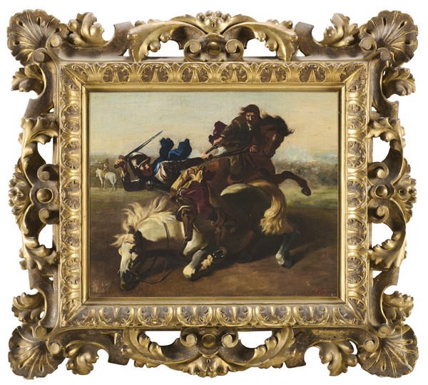 Lotto 879 | Scuola del secolo XIX "Scene di battaglia" coppia di dipinti ad olio su tela (