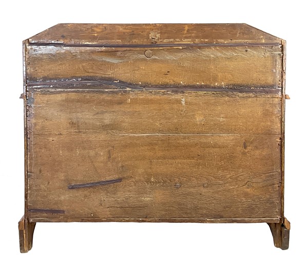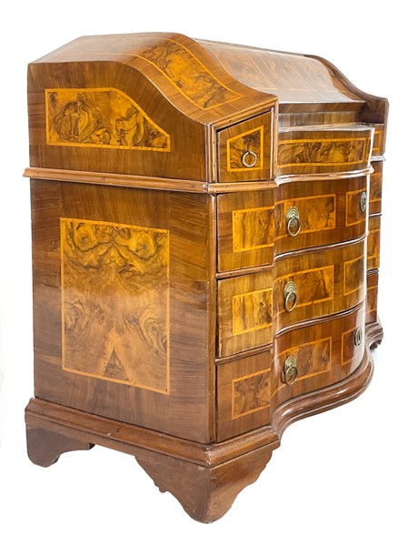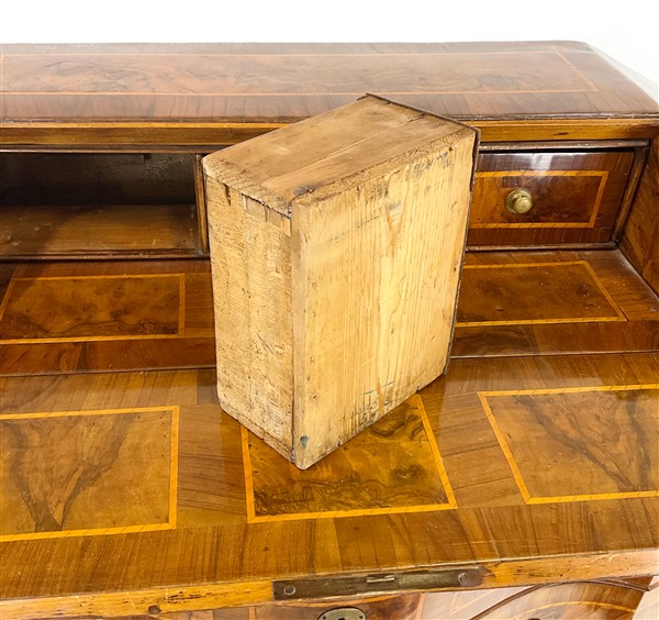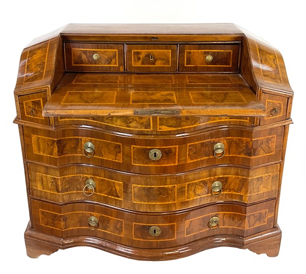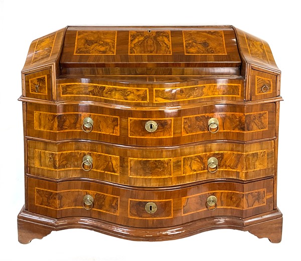 Ribalta lastronata in noce e radica di noce e filettata con fronte mosso a tre cassetti, calatoia celante tre cassettini e piano con segreto, piedi a mensola. Verona, secolo XVIII (cm 124x112x56) (difetti e restauri)