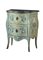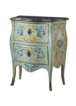 Cassettoncino di forma mossa in legno laccato e decorato in policromia a fiori entro riserve, fronte a due cassetti. Piano in marmo sagomato. Secolo XVIII (cm 73x86x40) (difetti e restauri)