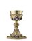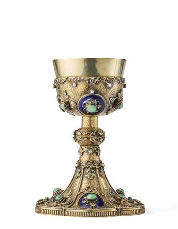 Calice in argento vermeil inciso a volute, fiori e smalti policromi. Decorato i
