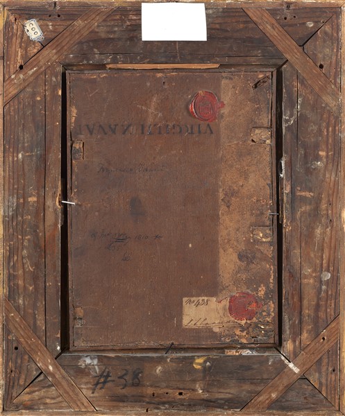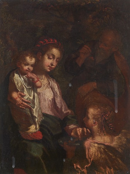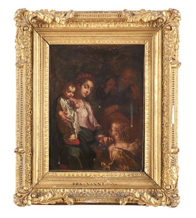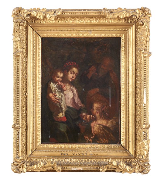 Francesco Vanni (attr.) "Riposo durante fuga in Egitto" olio su carta applicata
