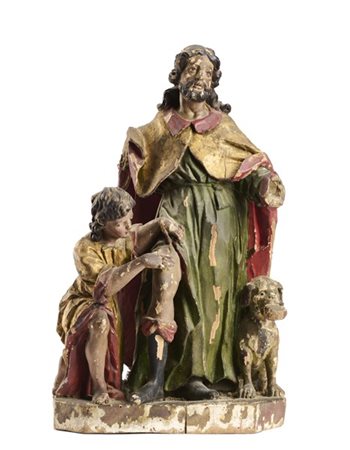 Scultore del secolo XVIII. "San Rocco con fanciullo" in legno intagliato, lacca