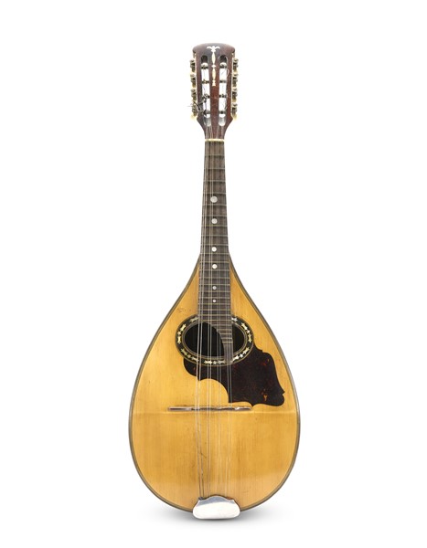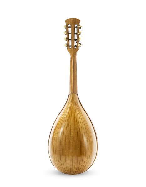 Fondo di 30 doghe in acero, tavola in due pezzi di abete, manico e paletta in acero massiccio, battipenna in finta tartaruga, palette delle meccaniche in plastica, etichetta "N 521 Anno 1948 / INSIGNITO / CON / LE PIÚ ALTE ONORIFICENZE / LUIGI EMBERGHER / MARCA / DEPOSITATA / ROMA VIA BELSJANA / N° 7", ulteriore etichetta "Direzione e Laboratorio in Arpino", timbrato a fuoco sul retro della paletta "L. EMBERGHER / ROMA", in ottime condizioni (lunghezza della corda vibrante mm 330) (cm 23 x 19,5). Con una sacca di tela