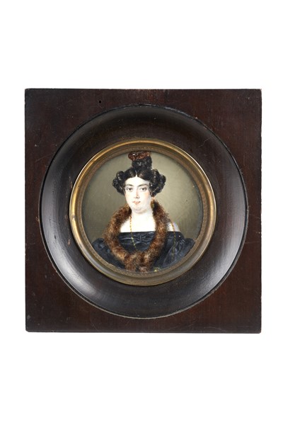 Maestro del secolo XIX. "Ritratto di dama con collo in pelliccia" miniatura ton