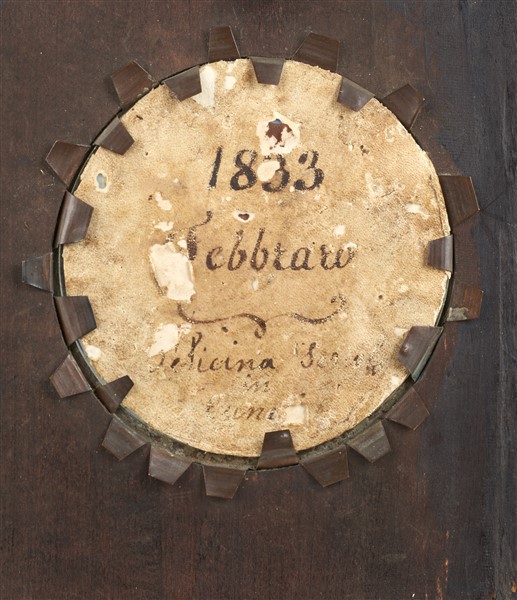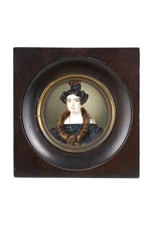Maestro del secolo XIX. "Ritratto di dama con collo in pelliccia" miniatura tonda su avorio (d cm7) iscritta indistintamente e datata Febbraio 1833 al retro (difetti)