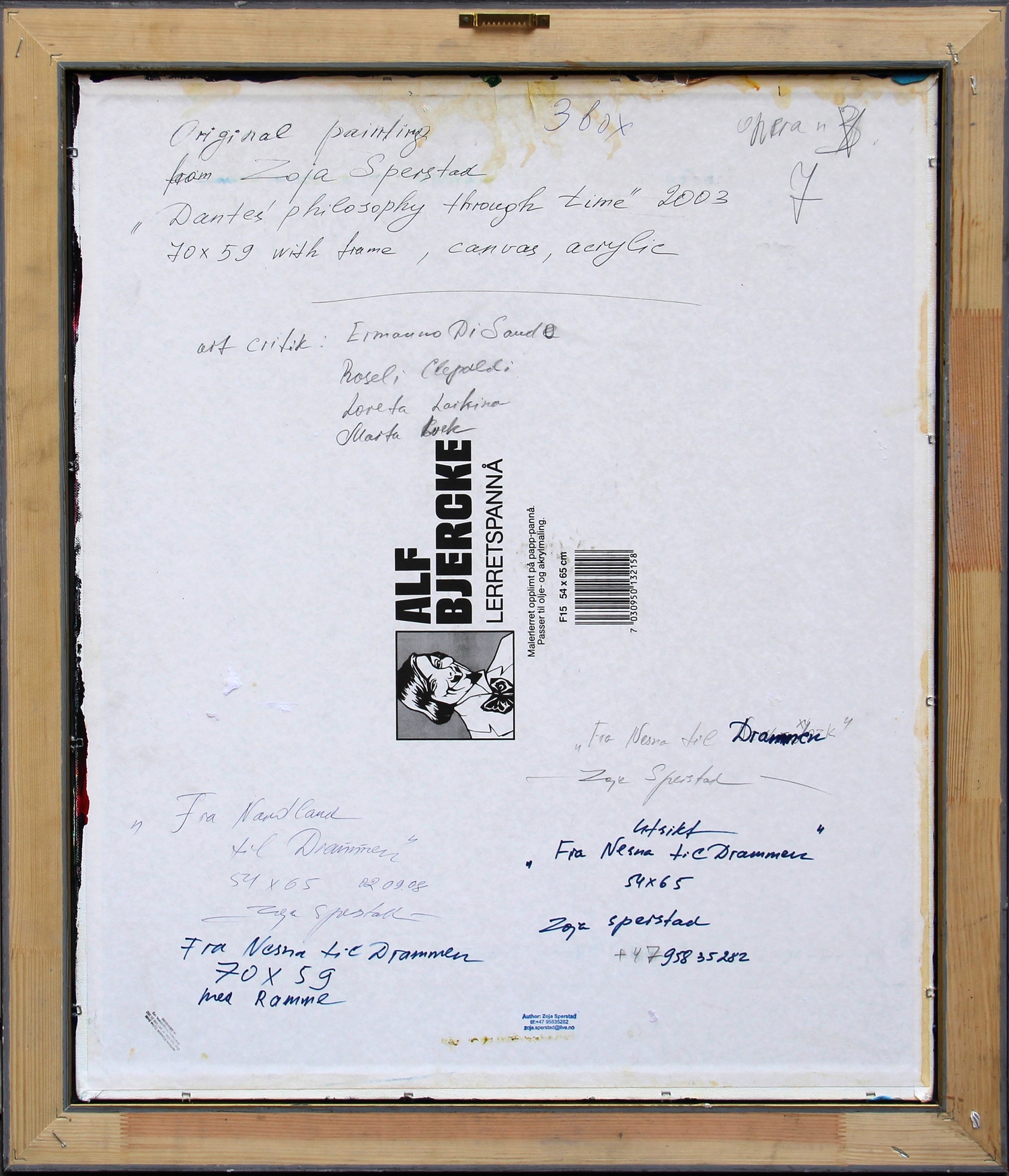 Scritta, firma, titolo, data, misura, tecnica "Original painting from Zoja Sperstad, Dante's philosophy through time, 2003, 70x50 with frame, canvas, acrylic" (al retro)