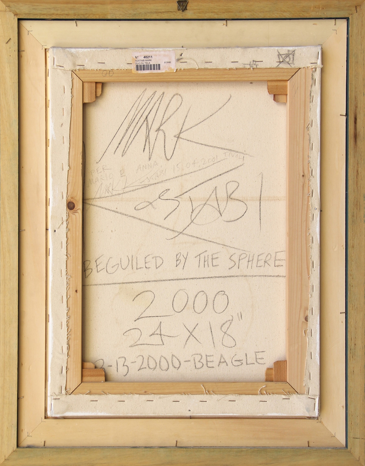 Firma, titolo, data, misure, numerazione, dedica "Mark Kostabi, Beguiled by the sphere, 2000, 24x18, 3-13-2000-Beagle" (al retro)