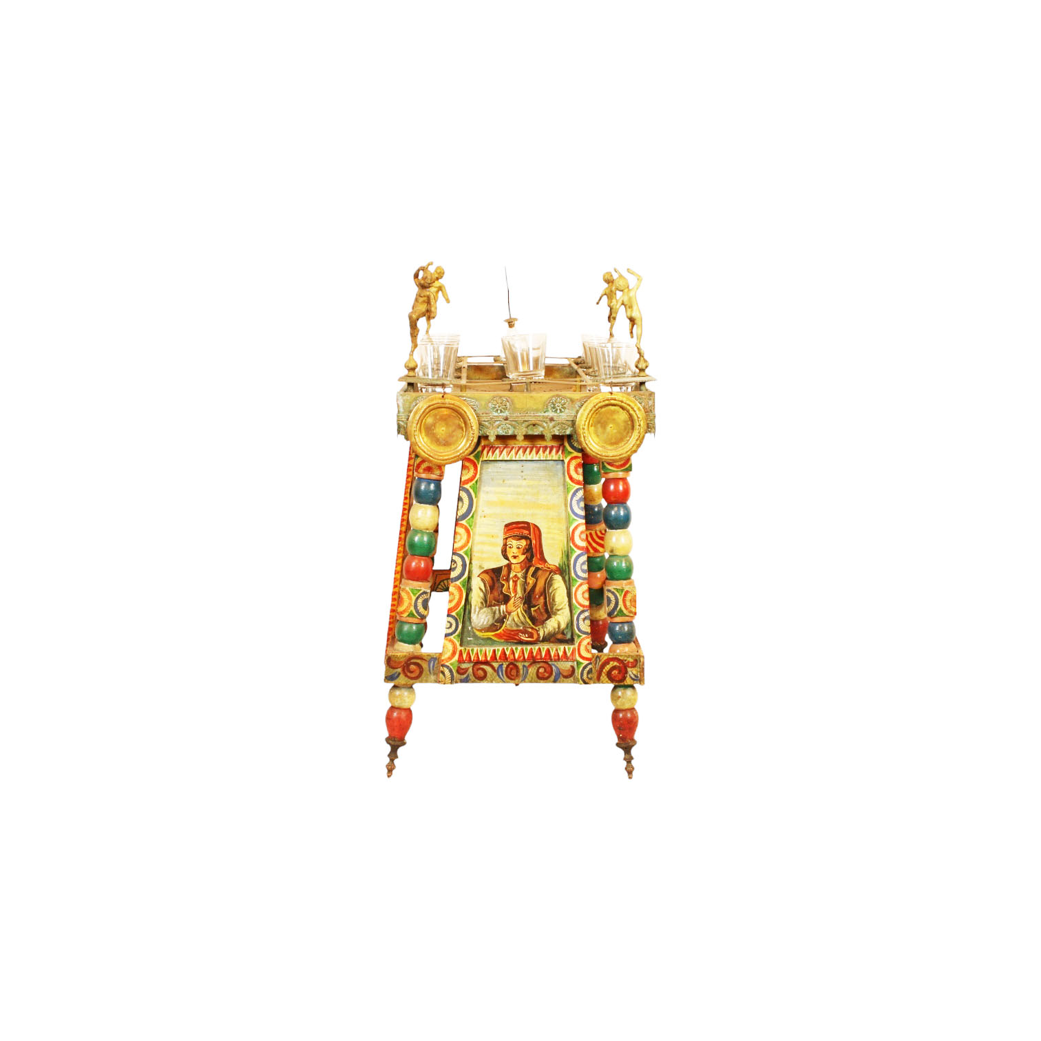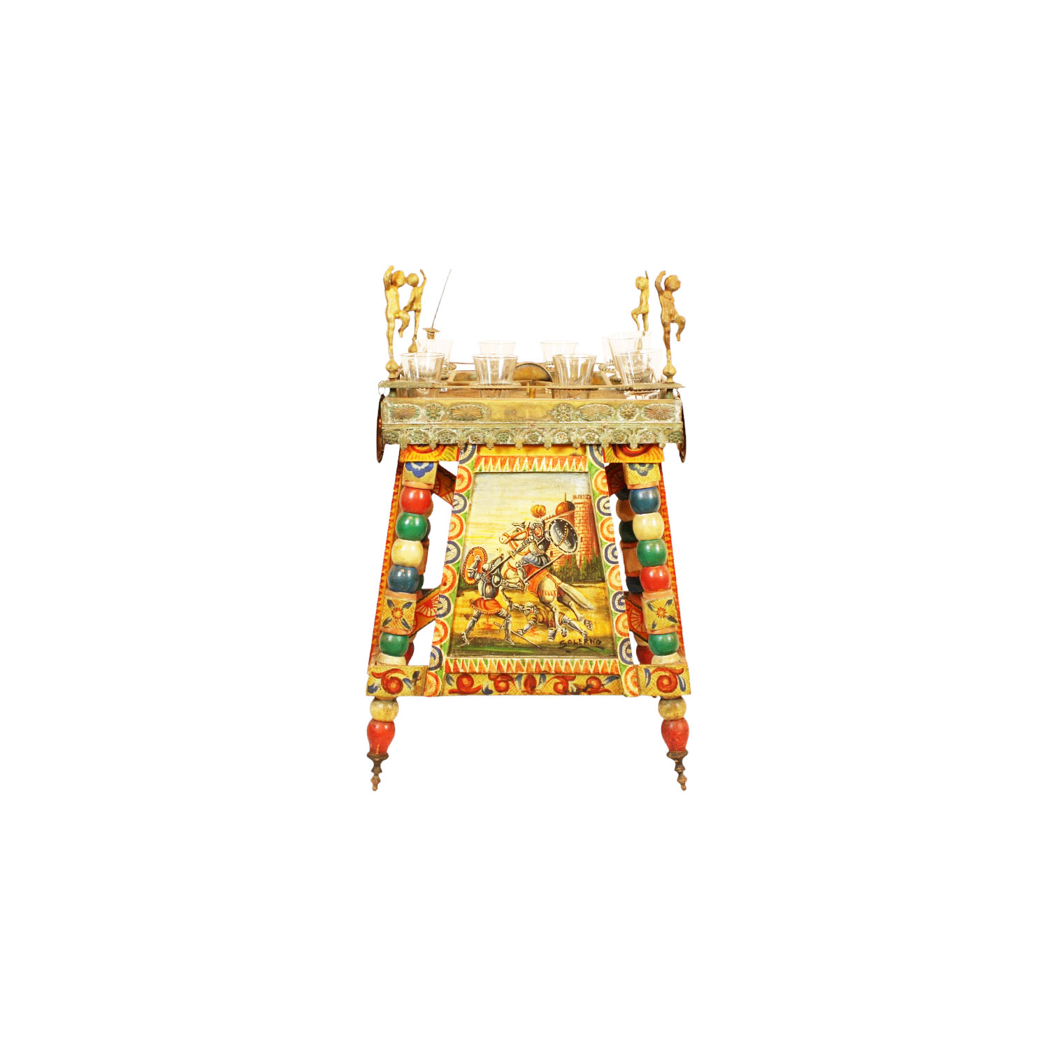 CURIOSO TAVOLINO in legno dipinto in policromia e raffigurante personaggi con cassettino e piano porta bicchieri in rame balzato con figure agli angoli in metallo cesellato firmato Salerno prima metà XX secolo h cm 95,5 x 54 x 46