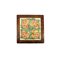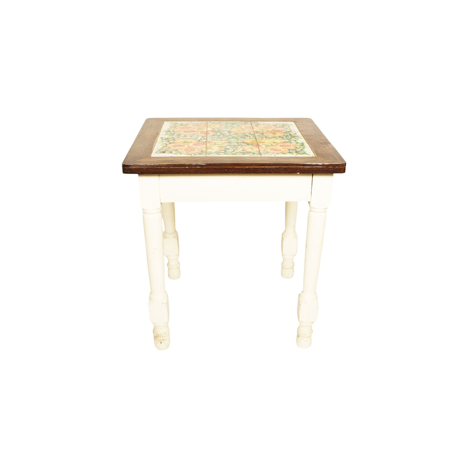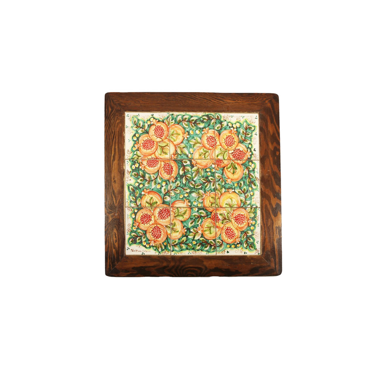 TAVOLO in legno di castagno di forma quadrata con base laccata e piano composto da 9 mattonelle in ceramica dipinta in policromia raffigurante melograni , manifattura Fabio Boria Caltagirone XX secolo h cm 80 x 78 x 79