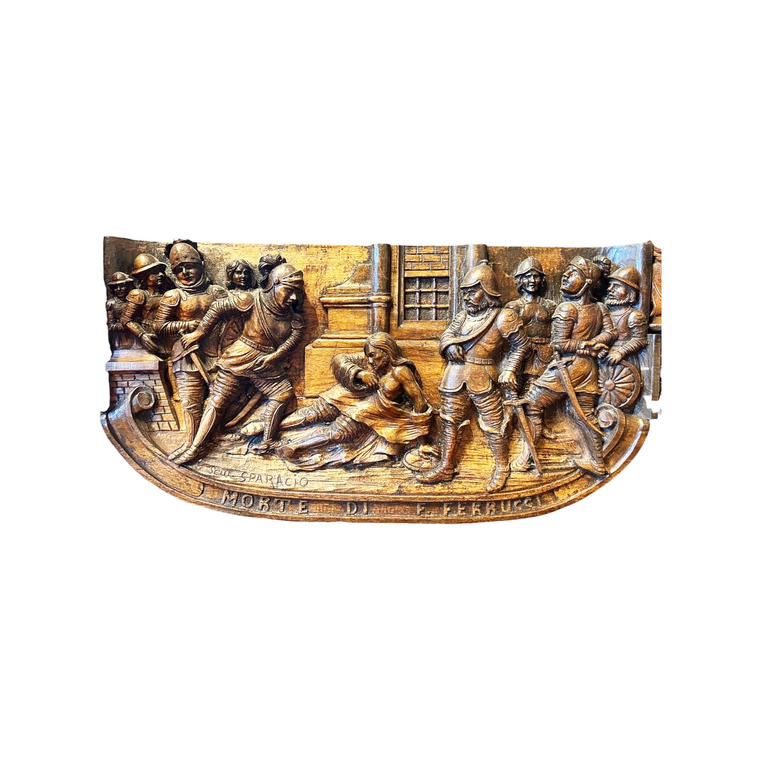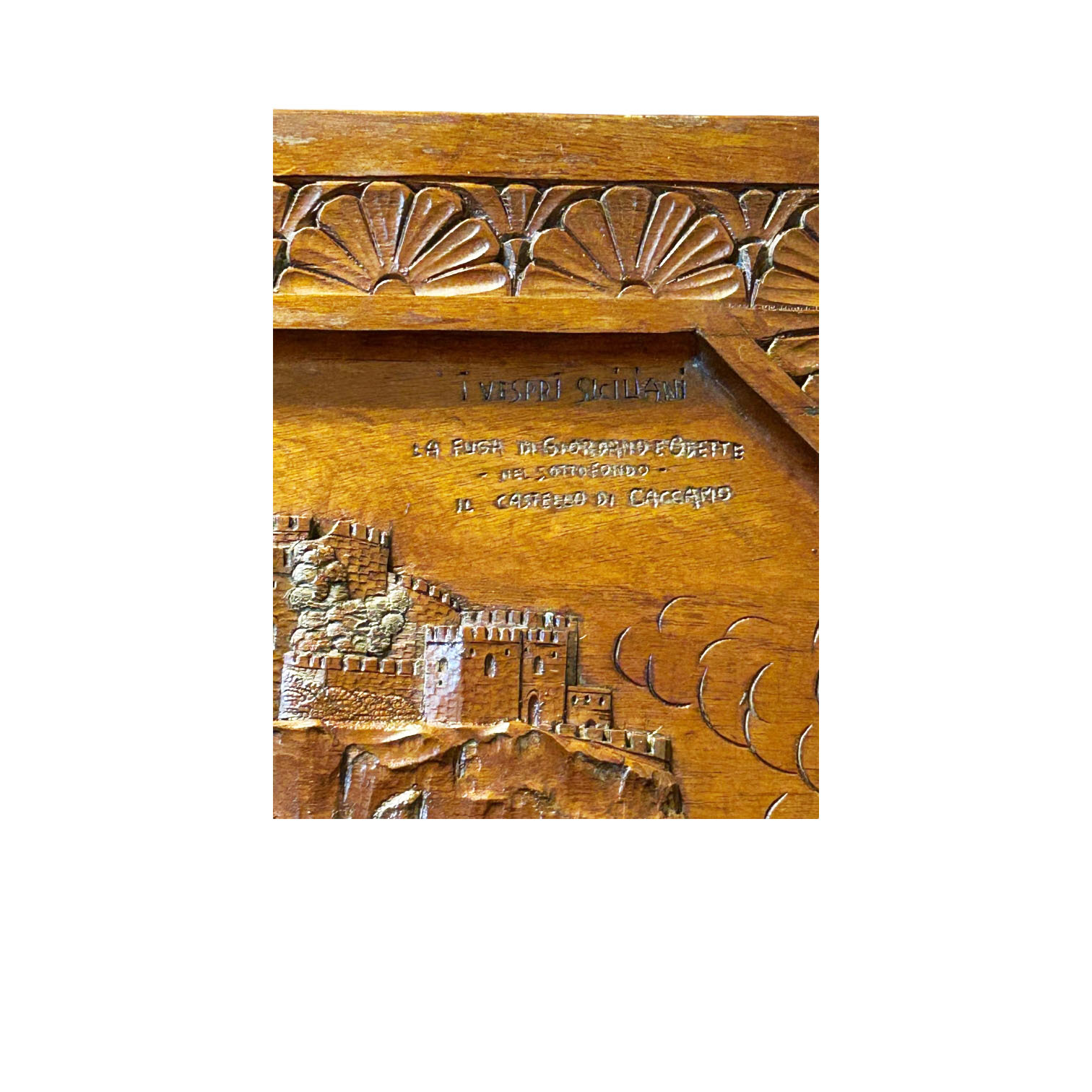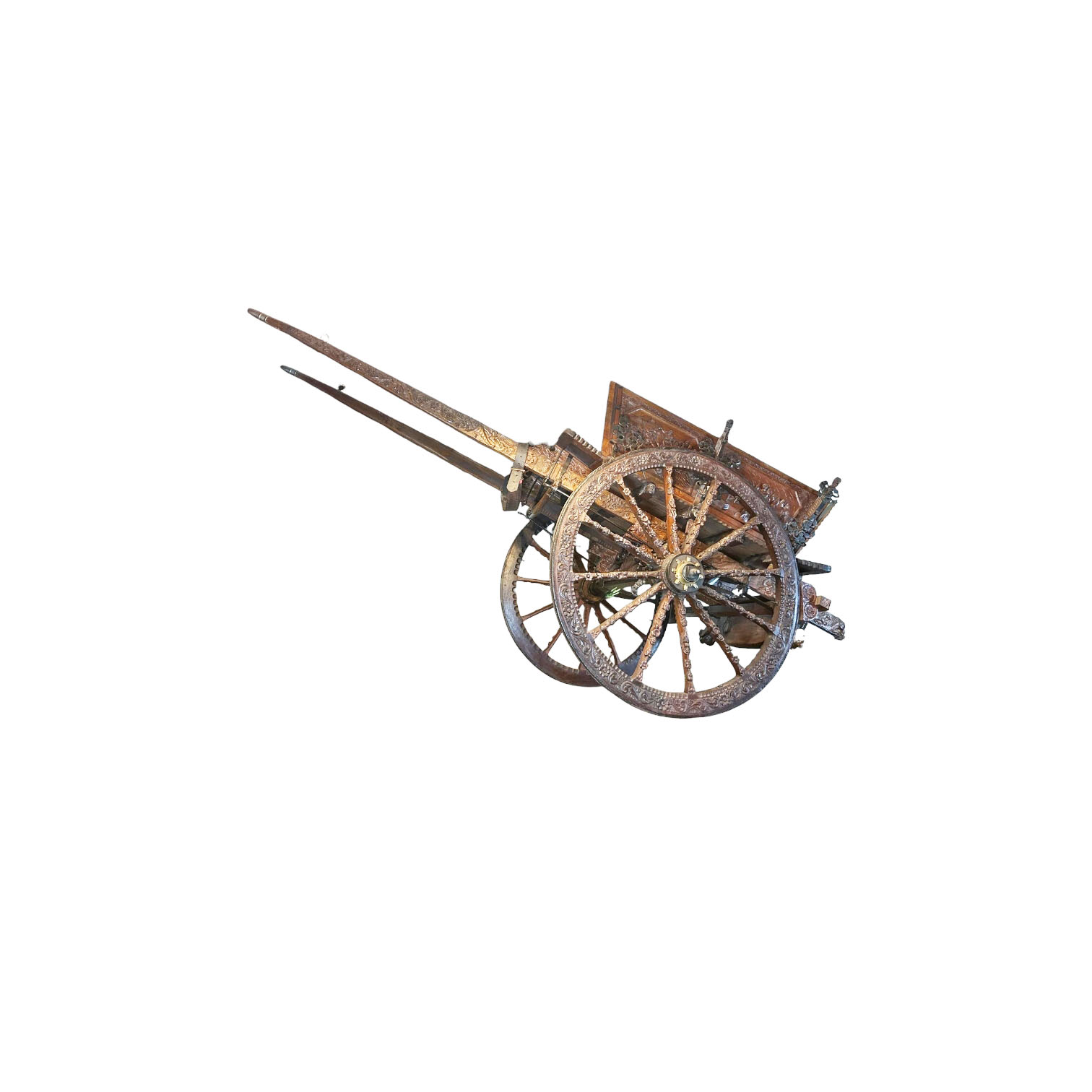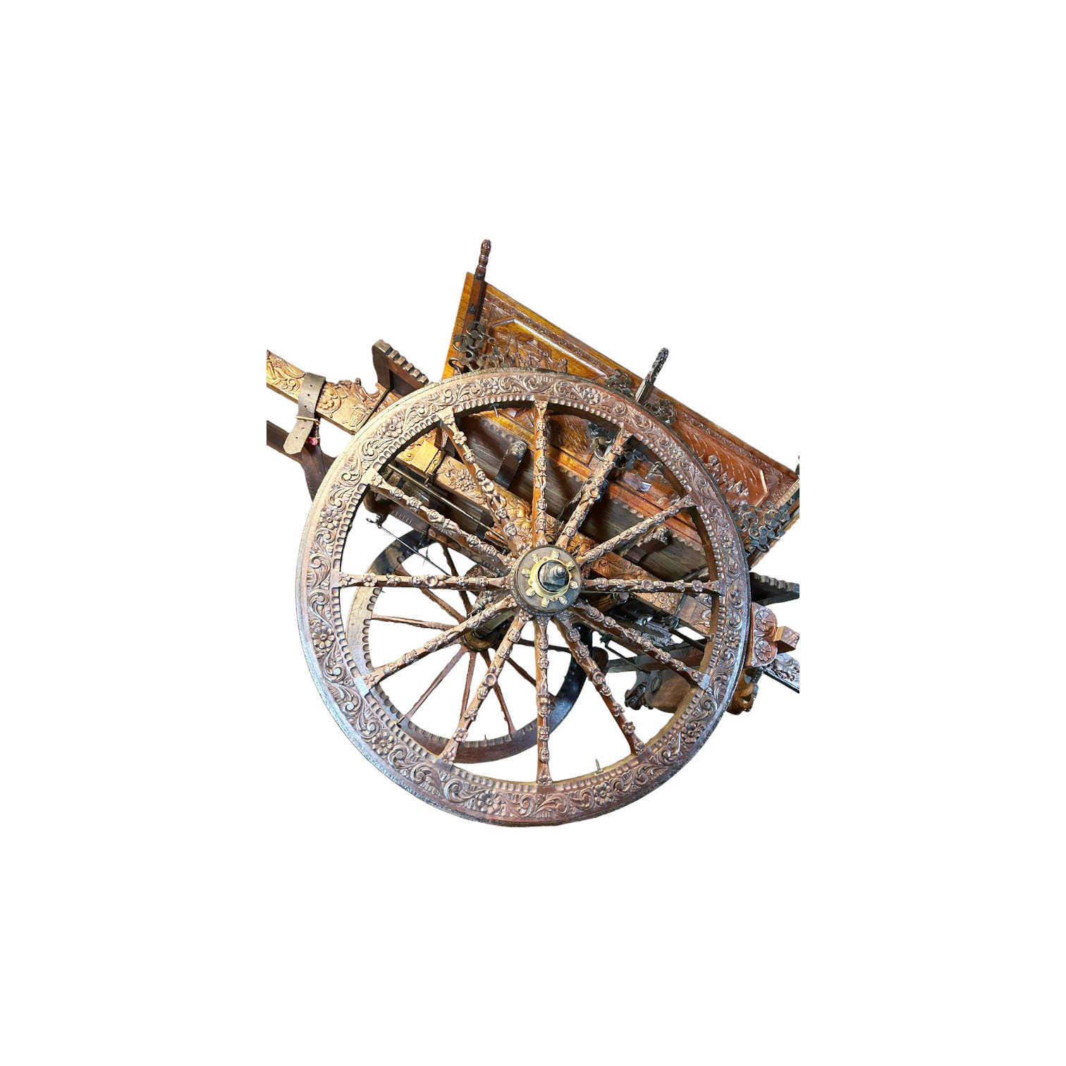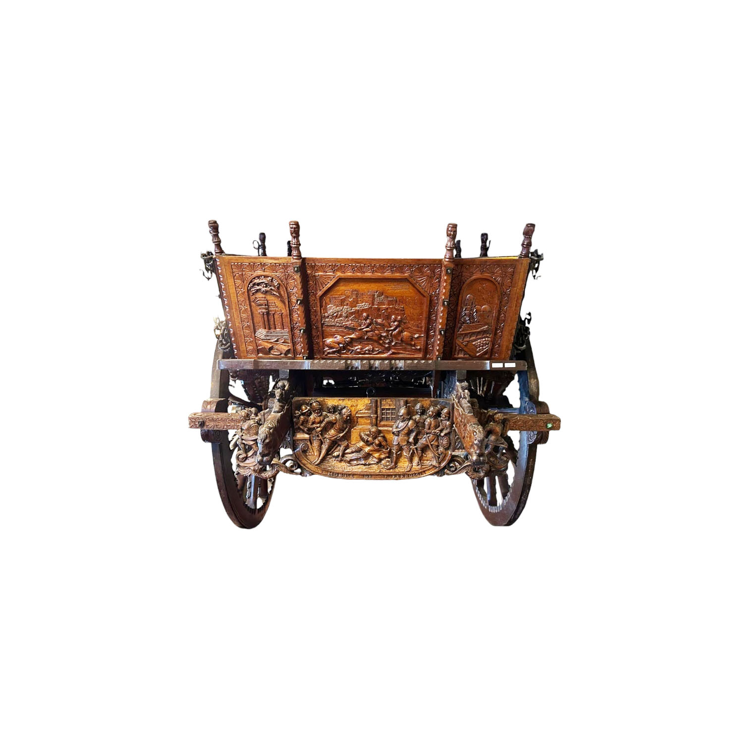 RARO ED IMPORTANTE CARRETTO SICILIANO in legno di noce interamente scolpito ad alto rilievo , parte interna interamente dipinta in policromia, sponde raffiguranti Duca della Motta e Beati Paoli scena "Noi conosciamo i tuoi delitti", Garibaldi e i suoi picciotti entra a Palermo, duello rusticano, duello la giara, portellone posteriore raffigurante i vespri siciliani, la fuga di Giordano e Orette, nel sottofondo castello di Caccamo. Ai lati veduta sulla cappella Palatina ed i templi di Agrigento, sulla chiave raffigurante la morte di F.Ferrucci. Ruote interamente scolpite raffiguranti personggi e flora. Aste raffiguranti scene di battaglia cornucopie e stemma nobiliare, arricchito da decorazioni in ferro battuto, firmato dal maestro scultore Sparacio..... h cm 160 x 180 x 370