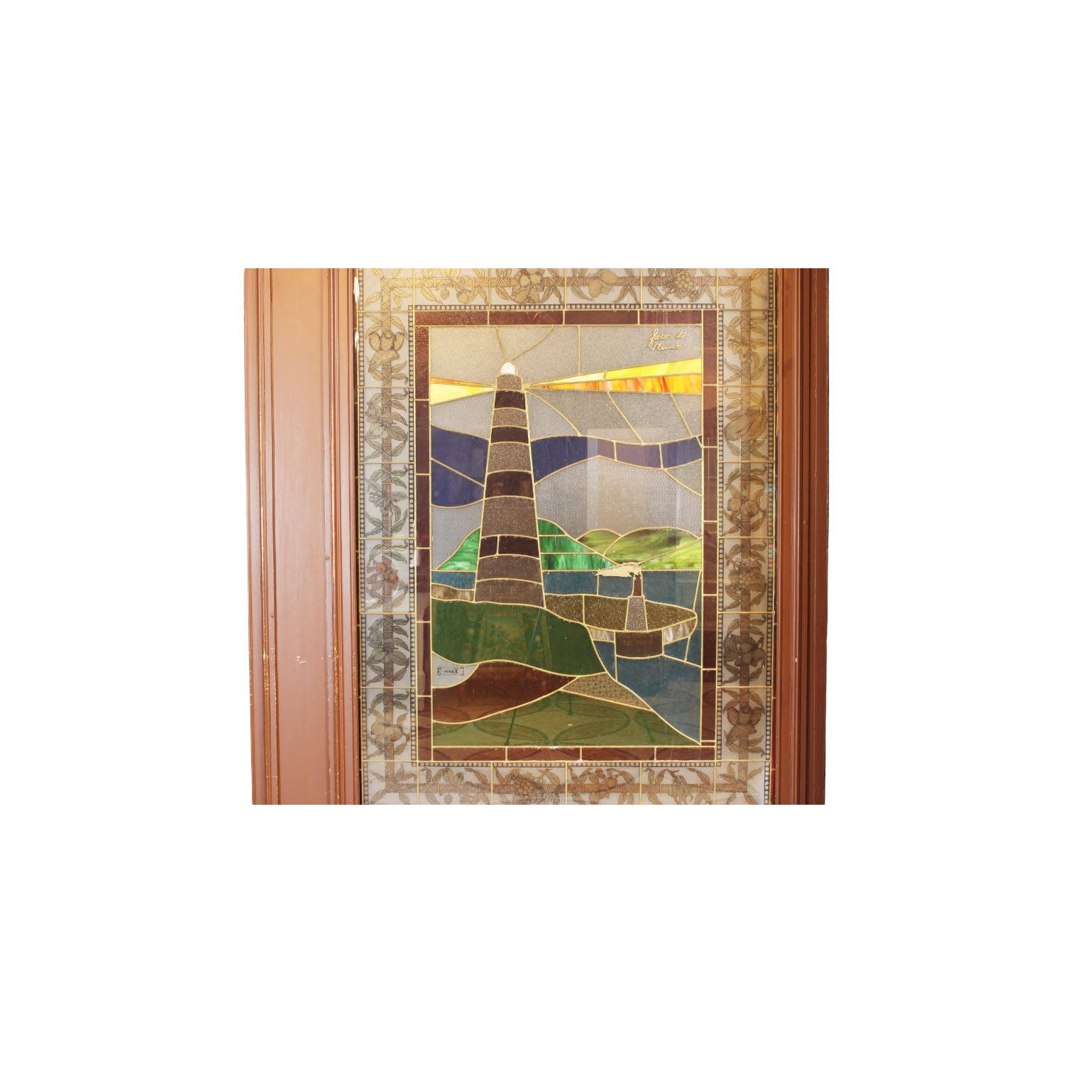 VETRATA PIOMBATA raffigurante faro di Messina realizzata con vetri colorati e incisi, firmata da A. Xausa maestranze siciliane XX secolo h cm 163 x 153