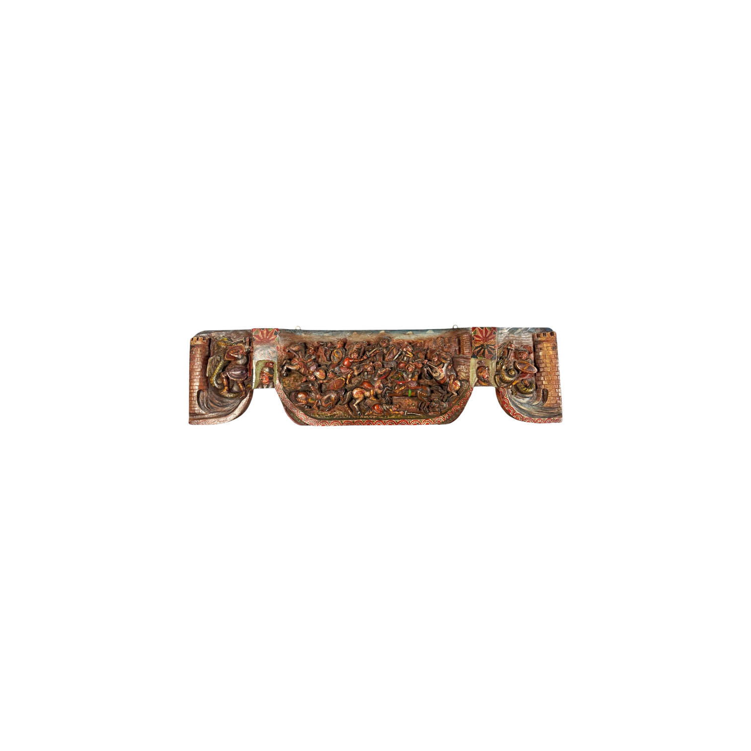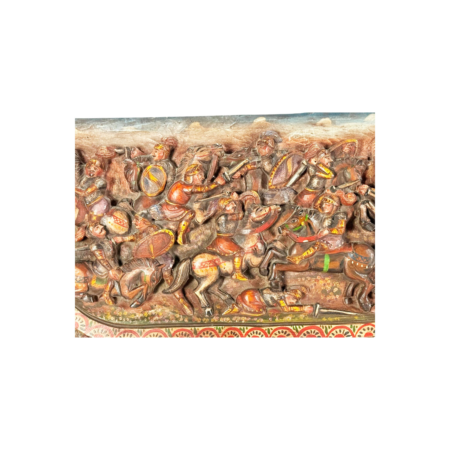 CHIAVE DI CARRETTO in legno finemente scolpito dipinta in policromia raffigurante scena di battaglia maestranze siciliane prima meta' XX secolo h cm 34 x 120