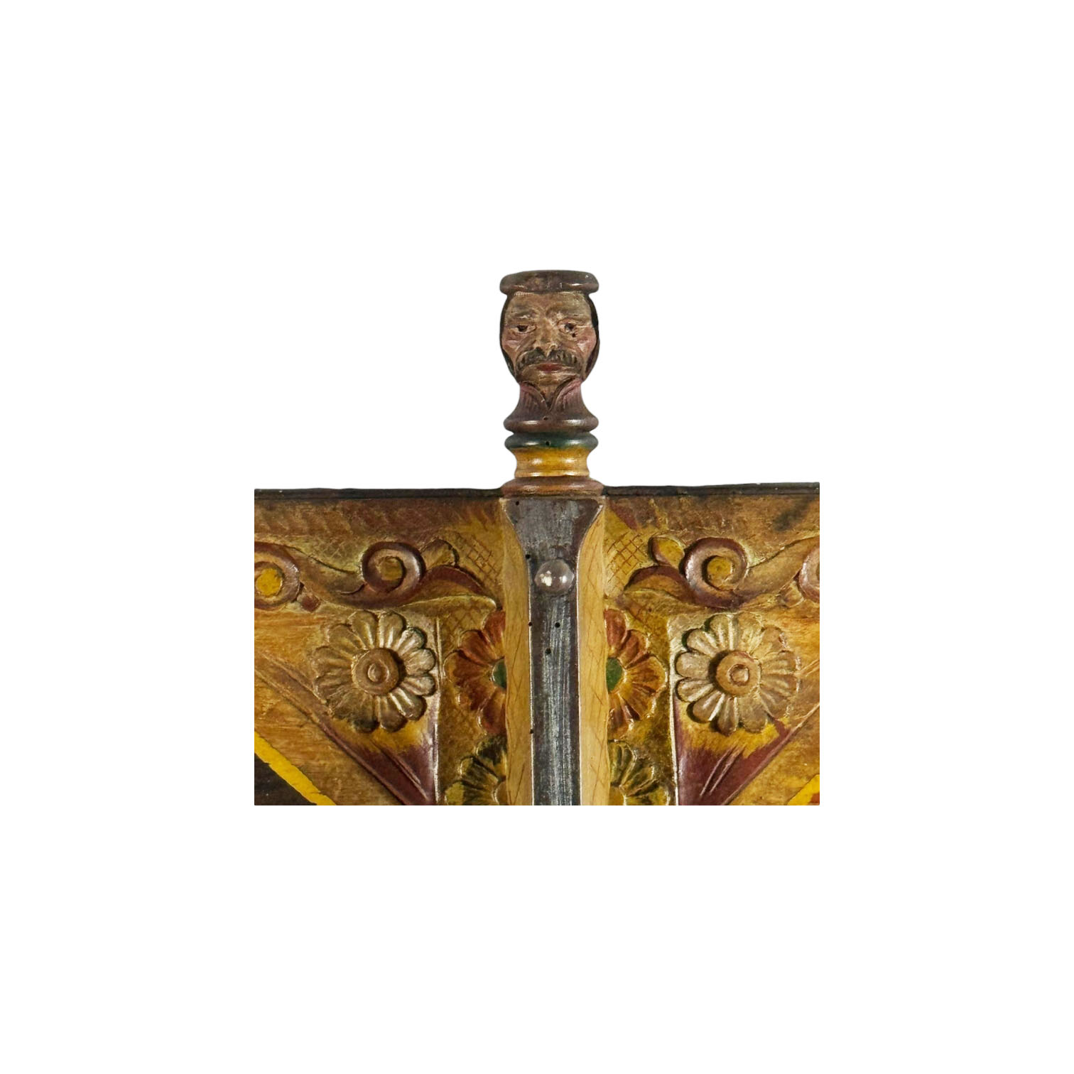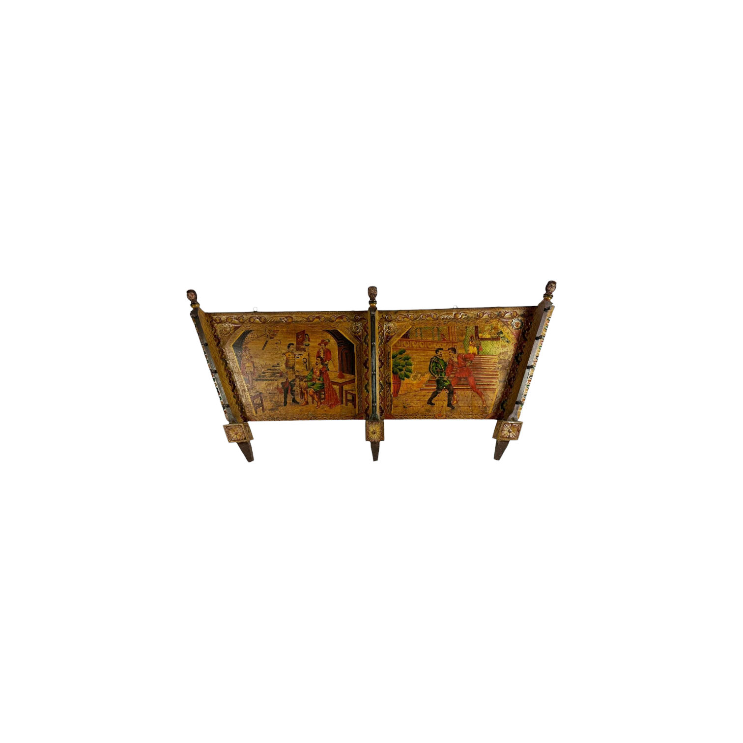 SPONDA DI CARRETTO in legno scolpito e dipinto in policromia raffigurante scene di vita di Don Giovanni costruito Giuseppe Manfrè arricchito da decorazioni in ferro XX secolo h cm 70 x 146