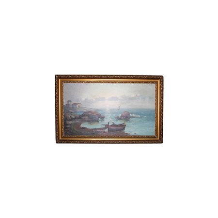 OLIO SU TELA raffigurante marina con barche e pescatori firmato Vincenzo Udine in basso sx Palermo 1898-1981. dentro cornice in legno dorato h cm 70 x 120/ cornice h cm 90 x 138