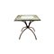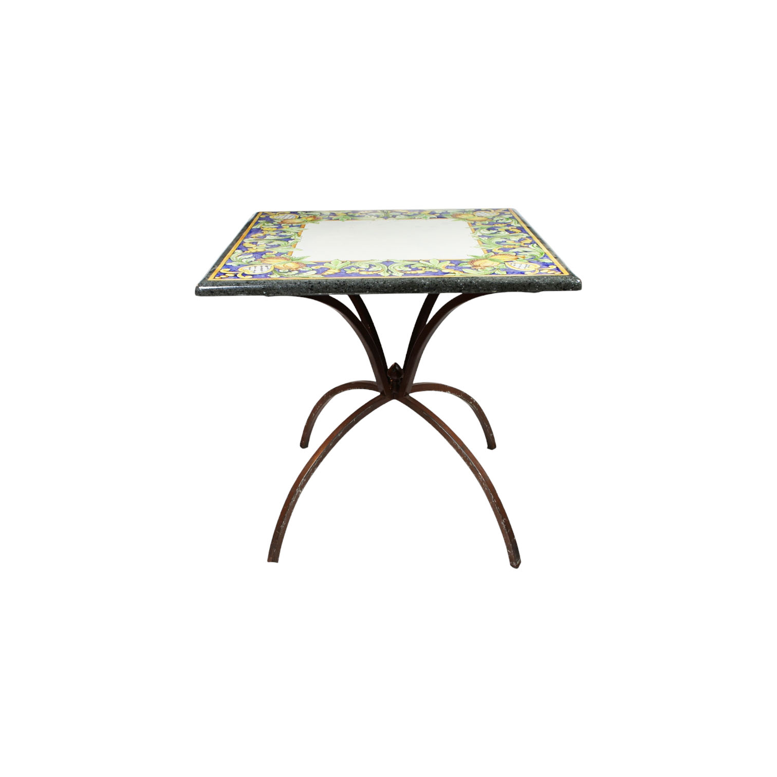 TAVOLO con forma quadrata con piano in pietra lavica smaltata a motivi grotteschi e melograni, base in ferro a firma Pirrera XX secolo h cm 81 x 85 x 85