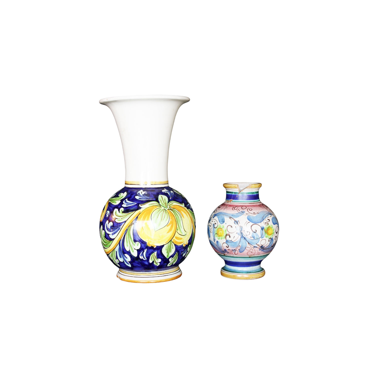 DUE VASI in maiolica dipinta manifattura S.Gurreri Caltagirone e uno Tony Cascio Sciacca usure del tempo e rotture XX secolo h cm 30 x 17 / h cm 16 x 13