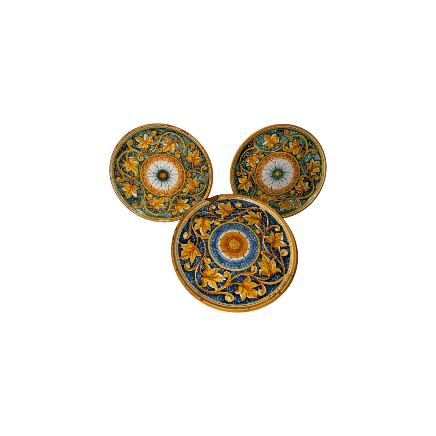 LOTTO DI TRE PIATTI in maiolica policroma decorata a motivi fogliacei ,difetti usura del tempo manifattura quinta essenza XX secolo cm Ø 30,5