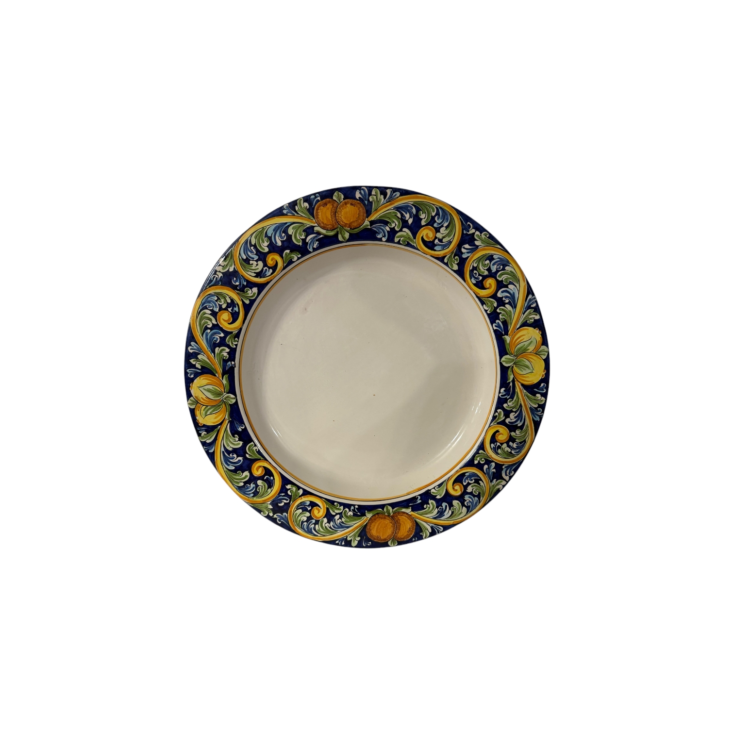 GRANDE PIATTO in maiolica policroma dipinto a motivi floreali e frutta ,sbeccature e usure del tempo manifattura Caltagirone S. Guarrerri XX secolo cm Ø 54
